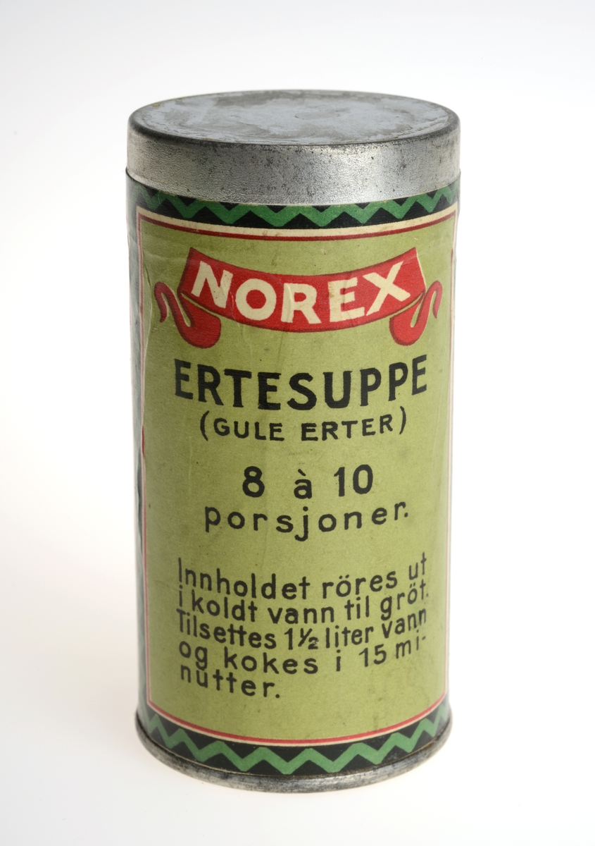 Halvfabrikata boks med ertesuppe, etterkrigstid. Kilde: Sverresborg Trøndelag Folkemuseum FTT.50674